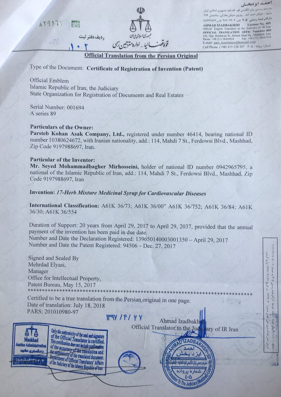 The invention with No. 94506 was registered on 27.12.2018 as a syrup of 17 medicinal plants (Cardi Ay) to treat cardiovascular problems. This product on 23.01.2018 with No. 56532 by the letter of the Department of Technology, Ferdowsi University of Mashhad, after scientific validation (with the feature of being new, being innovative, and the applicability of the mentioned items, in the field of technical knowledge and procurement method) is approved.